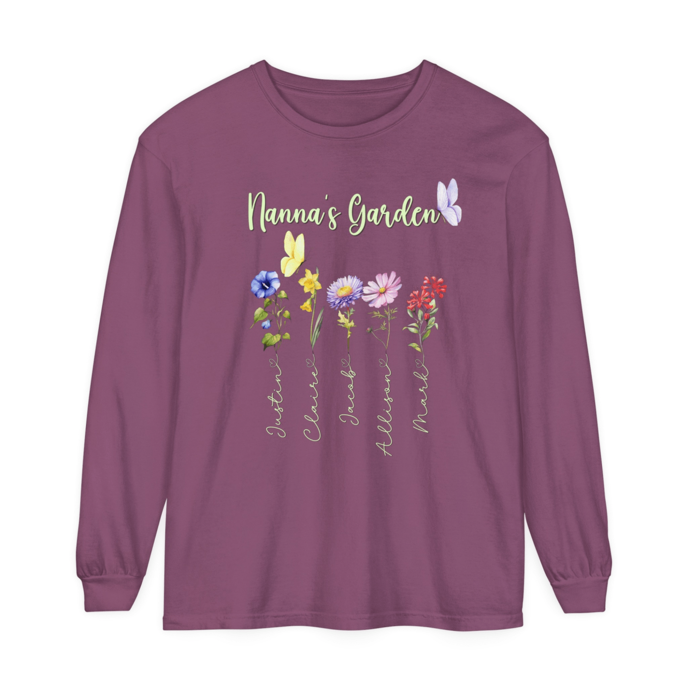 On the front, it says “Mama’s Garden or Grandma’s Garden.” But here’s where it gets really cool—the shirt has a row of flowers, and each flower represents the birth month of one of us. So, if you were born in June, there’ll be a rose for you, and if I was born in October, there’ll be a marigold for me. Neat, right?