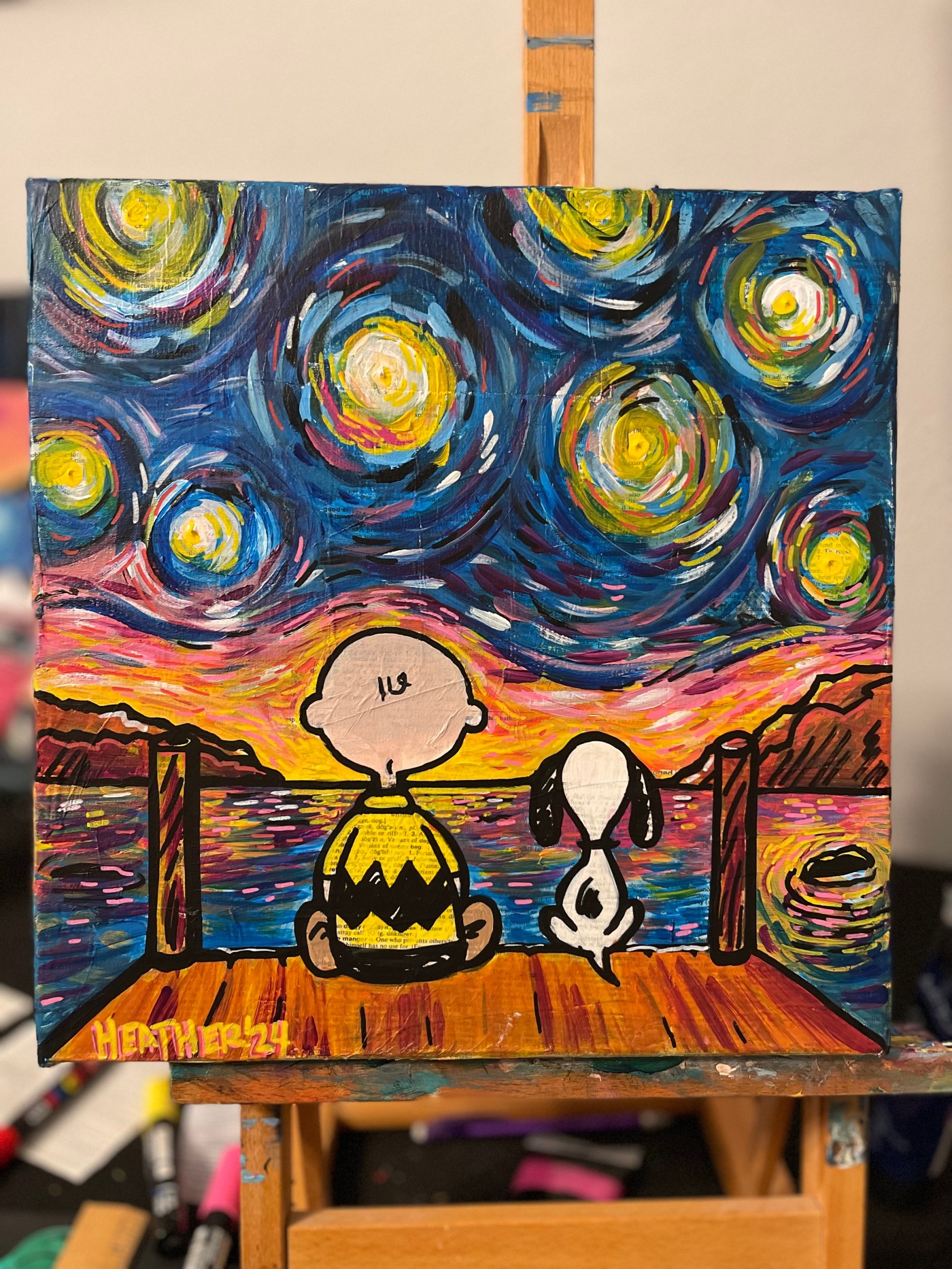 Imagine a boy and his dog chilling on a pier, staring up at this amazing starry sky. It’s kind of like “Starry Night,” but the style has more of a Da Vinci vibe—detailed, not too over the top, but still super cool. The stars are shining, and the night sky swirls in a way that feels both artistic and real. The water beneath them reflects the stars, making everything look even more magical. It’s just this quiet moment where the boy and his dog are lost in the view, soaking in the calm and beauty of the night.