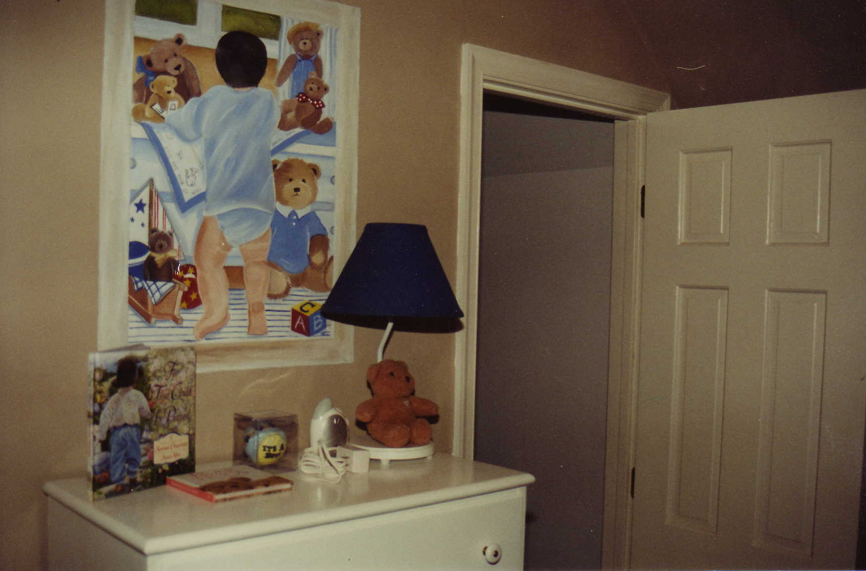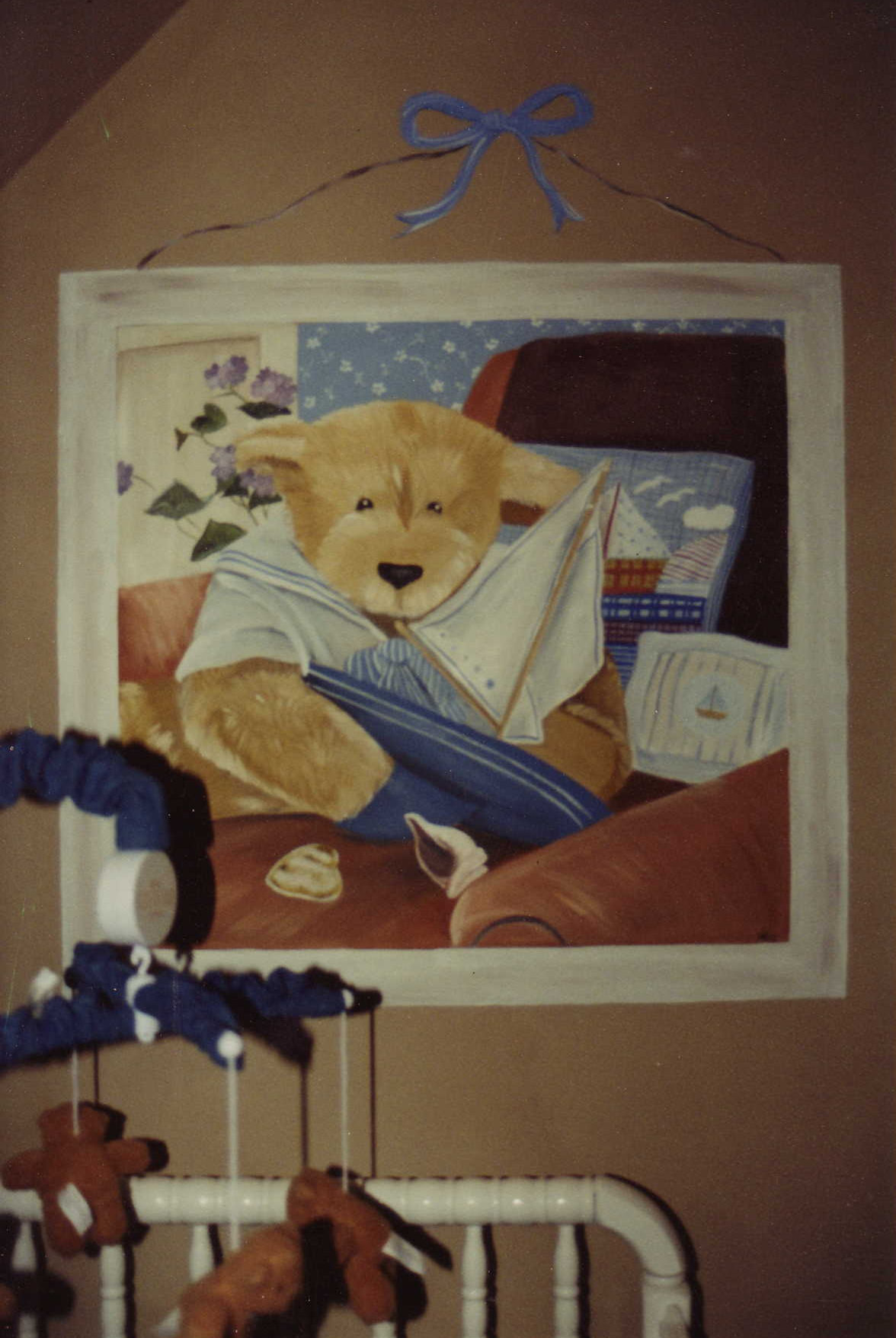 This Teddy Bear Mural was painted on my nephews’ nursery wall. The wall was textured, but the result still came out great!